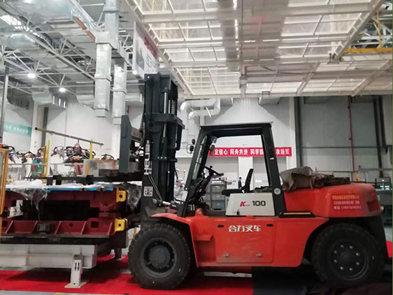 廣汽乘用車宜昌分公司準備設備安裝,需要10噸叉車對液壓機裝模具,走進焊裝車間眼前一亮:一批批紅色的多功能智能機器人正圍著各自需要焊接的汽車零件揮舞著手臂作焊裝調試;有的一個組件有四、五機器人在焊裝,有的有七、八個機器人,也有的有十多個—-分成多個單元來完成組裝任務,很少看到人在操作,機器代替人是場全新的革命,此時是最好的見證。今天也有幸在這個車間給液壓沖壓設備安裝模具,這些設備將機器人焊接的小零件沖壓成型汽車的前蓋、后蓋———一共有六個液壓沖壓設備;也有六套模具,最重的有9.8噸,最輕的也有8噸重,我的任務是先用10噸叉車將模具架叉到沖壓設備安裝模具架的位置由專業安裝人員安裝,模具架上面有二條凸起的軌道;然后用叉車分別將9噸左右的模具叉到模具架上,(叉路在模具上面)用模具下面的卡槽對準模具架上的軌道,一開始要對準很難的,因為你看不到下面的軌道,嘗試了多次終于對上,再將模具推到設備里面。說實話有點難,但做事沒有任何理由不做好,慢慢地后面的幾套模具也得心應手。